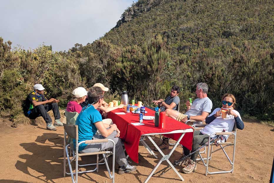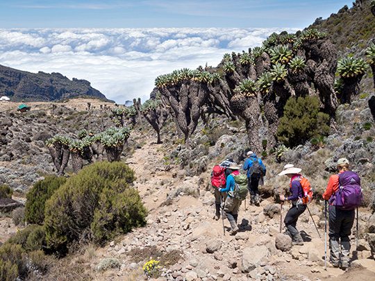 A longer trekking day that takes you deeper into Kilimanjaro’s wilderness. The trail passes close to Lava Tower (4,600 m), an impressive volcanic formation, before descending slightly into a quiet valley at Moir Hut. This camp is remote and less visited, offering silence under the stars. It’s an excellent day for acclimatisation, giving you a real sense of the mountain’s vastness.